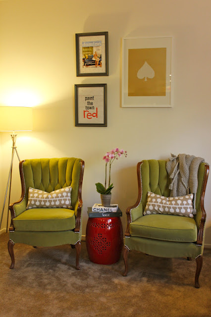 You might remember these gorgeous apple green chairs the hubby's grandmother so generously gave me. You know, the ones with the reupholstering nightmare? Anyway, I could not love them more! They add so much color and life. Any time you can add furniture to your home that tells a story, by all means do it!